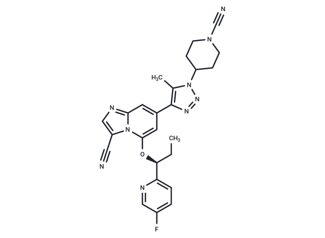 – O([C@@H](CC)C1=CC=C(F)C=N1)C=2N3C(C=C(C2)C4=C(C)N(N=N4)C5CCN(C#N)CC5)=NC=C3C#N