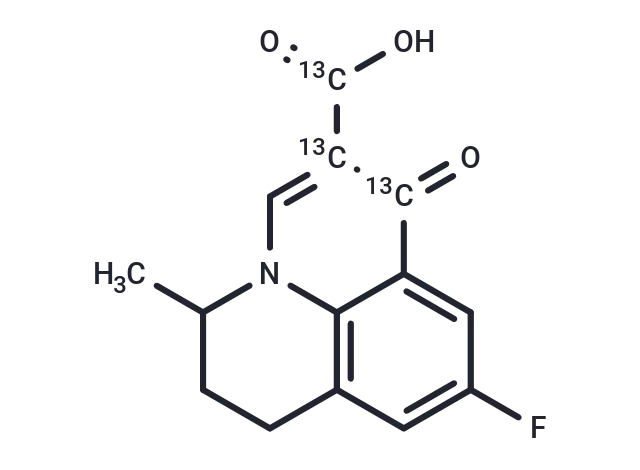 – Flumequine-13C3is intended for use as an internal standard for the quantification of flumequine by GC- or LC-MS. Flumequine is a fluoroquinolone antibiotic.1It is active againstS. aureus, S. pyogenes, B. subtilis, E. coli, P. aeruginosa, S. faecalis, andK. pneumoniae(MICs = 1-100 μg/ml). Flumequine is also active against field isolates of B. hyodysenteriae (MICs = 6.25-200 μg/ml).2It inhibits DNA gyrase, disrupting supercoiling of bacterial DNA to block transcription and replication.3