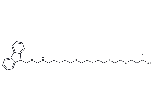– Fmoc-amino-PEG5-acid, a PEG-based linker for PROTACs, joins two essential ligands crucial for forming PROTAC molecules, enabling selective protein degradation by leveraging the ubiquitin-proteasome system within cells.