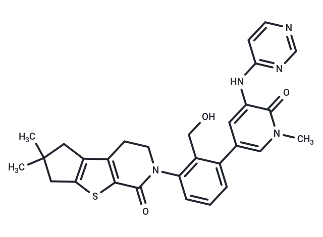 – O=C1C2=C(C3=C(S2)CC(C)(C)C3)CCN1C4=C(CO)C(=CC=C4)C=5C=C(NC=6C=CN=CN6)C(=O)N(C)C5
