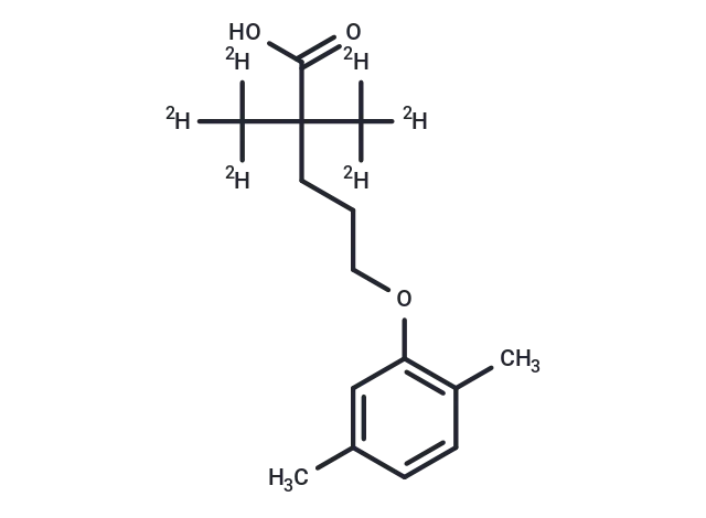 – Gemfibrozil-d6 is intended for use as an internal standard for the quantification of gemfibrozil by GC- or LC-MS. Gemfibrozil is a peroxisome proliferator-activated reporter α and PPARγ agonist. In vivo, gemfibrozil reduces serum total cholesterol, triglyceride, and LDL levels in a rat model of high-cholesterol diet-induced hyperlipidemia. Gemfibrozil reduces atherosclerotic plaque area, superoxide production, and expression of the genes encoding the NF-κB subunit p65 and chemokine (C-C) motif ligand 2 (CCL2) in ApoE-/- mice. Formulations containing gemfibrozil have been used in the treatment of high cholesterol.