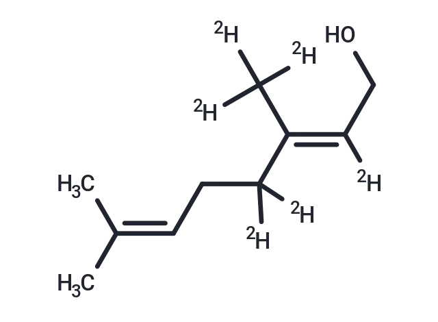 – Geraniol-d6 (Major) is a deuterated form of Geraniol (Major). Geraniol is an orally active monoterpenoid and alkenic compound. It inhibits cell proliferation and promotes apoptosis (apoptosis). Geraniol exhibits antimicrobial, antifungal, antioxidant, anti-inflammatory, and antitumor activities. Geraniol is utilized in diabetes research.