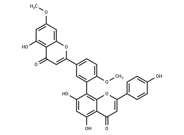 – 1. Ginkgetin has anti-influenza virus and anti-fungal activities. 2. Ginkgetin has anti-inflammatory activity, can down-regulates COX-2 induction in vivo against skin inflammatory responses. 3. Ginkgetin is a good STAT3 inhibitor and may be a useful lead molecule for development of a therapeutic STAT3 inhibitor. 4. Ginkgetin induces apoptosis in PC-3 cells via activation of caspase 3 and inhibition of survival genes as a potent chemotherapeutic agent for prostate cancer treatment. 5. Ginkgetin has neuroprotective activity against neurological injury induced by MPTP occurs via regulating iron homeostasis, it may provide neuroprotective therapy for Parkinson’s disease and iron metabolism disorder related diseases.