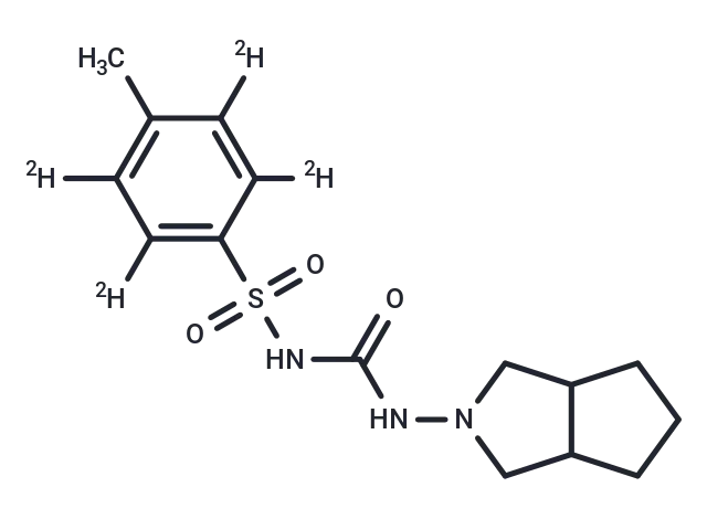 – Gliclazide-d4 is intended for use as an internal standard for the quantification of gliclazide by GC- or LC-MS. Gliclazide is a sulfonylurea and an inhibitor of pancreatic β-cell ATP-sensitive potassium (KATP) channels. It is selective for pancreatic β-cell over cardiac and arterial smooth muscle cell KATP channels. Gliclazide (5 μM) increases insulin-induced glucose uptake and glucose transporter 4 (GLUT4) translocation to the plasma membrane in a differentiated 3T3L1 adipocyte model of insulin resistance induced by hydrogen peroxide. Gliclazide (5 and 10 μg/ml) reduces LDL oxidation by human aortic smooth muscle cells (HASMCs), decreasing TBARS content and 8-isoprostane levels. It also decreases oxidized LDL-induced HASMC proliferation and monocyte adhesion when used at concentrations ranging from 1 to 10 μg/ml. Gliclazide (5 mg/kg) reduces serum glucose levels and increases glucose uptake by isolated rat hindquarters in a model of diabetes induced by streptozotocin (STZ).