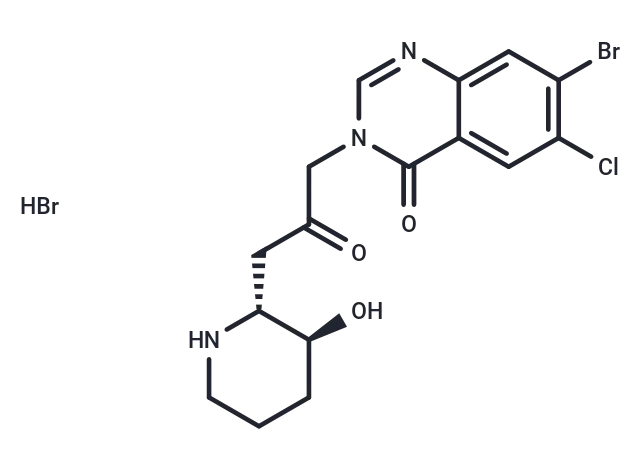 – Halofuginone specifically inhibits collagen type I gene expression and matrix metalloproteinase 2 (MMP-2) gene expression, which may result in the suppression of angiogenesis, tumor stromal cell development, and tumor cell growth. Halofuginone Hydrobromide is the hydrobromide salt of halofuginone, a semisynthetic quinazolinone alkaloid anticoccidial derived from the plant Dichroa febrifuga, with antifibrotic and potential antineoplastic activities. These effects appear to be due to halofuginone-mediated inhibition of the collagen type I and MMP-2 promoters. Collagen type I and MMP-2 play important roles in fibroproliferative diseases.