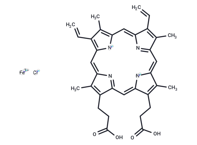 – Hemin (Hemin chloride) is a chlorinated iron-containing porphyrin, a heme oxygenase (HO)-1 inducer. Hemin has therapeutic activity in porphyrias by reducing heme deficiency in patients, thereby inhibiting δ-aminolevulinic acid synthetase activity through biochemical feedback.
