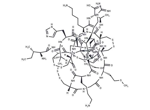 – [H][C@]12CSSC[C@]([H])(NC(=O)[C@]3([H])CSSC[C@H](NC(=O)[C@@H](N)[C@@H](C)CC)C(=O)N[C@@]([H])([C@@H](C)CC)C(=O)N[C@@H](Cc4ccccc4)C(=O)N[C@@]4([H])CSSC[C@H](NC(=O)[C@]([H])(CSSC[C@]([H])(NC4=O)C(=O)NCC(=O)N3)NC(=O)[C@H](CCSC)NC(=O)CNC1=O)C(=O)N[C@@H](CCCCN)C(=O)N[C@@H]([C@@H](C)O)C(O)=O)C(=O)N[C@@H](Cc1cnc[nH]1)C(=O)N[C@@H](CCCNC(N)=N)C(=O)N[C@@H](CO)C(=O)N[C@@H](CCCCN)C(=O)N2