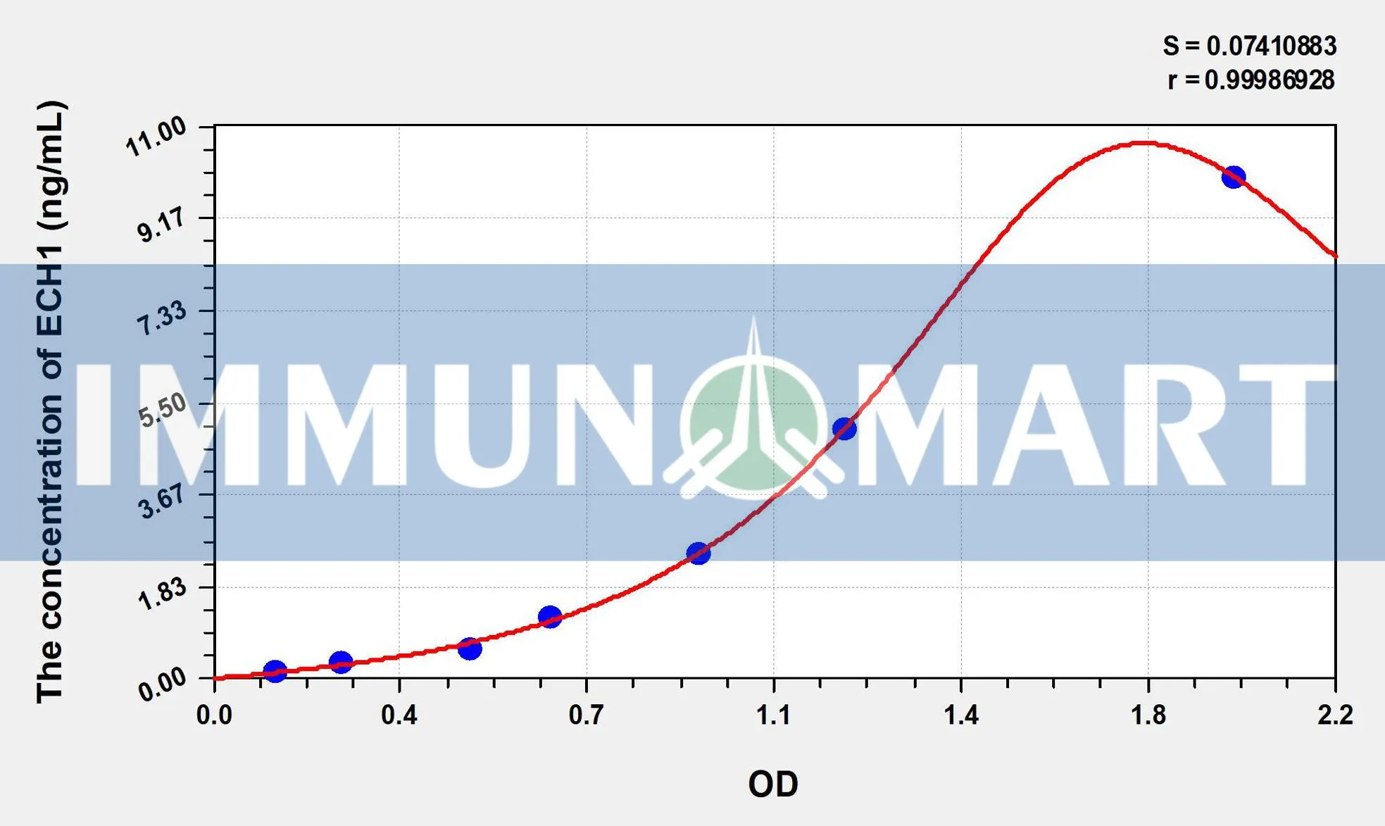 – The test principle applied in this kit is Sandwich enzyme immunoassay. The microtiter plate provided in this kit has been pre-coated with an antibody specific to Human ECH1. Standards or samples are added to the appropriate microtiter plate wells then with a biotin-conjugated antibody specific to Human ECH1. Next, Avidin conjugated to Horseradish Peroxidase (HRP) is added to each microplate well and incubated. After TMB substrate solution is added, only those wells that contain Human ECH1, biotin-conjugated antibody and enzyme-conjugated Avidin will exhibit a change in color. The enzyme-substrate reaction is terminated by the addition of sulphuric acid solution and the color change is measured spectrophotometrically at a wavelength of 450nm ± 10nm. The concentration of Human ECH1 in the samples is then determined by comparing the OD of the samples to the standard curve.