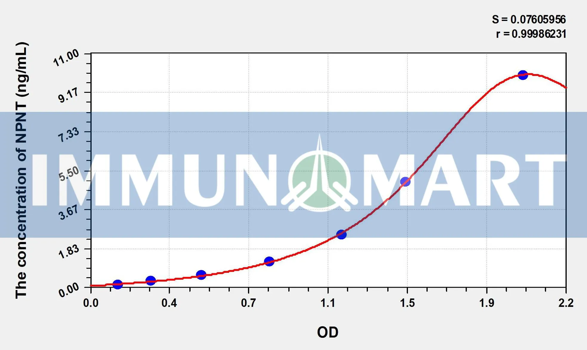 – The test principle applied in this kit is Sandwich enzyme immunoassay. The microtiter plate provided in this kit has been pre-coated with an antibody specific to Human NPNT. Standards or samples are added to the appropriate microtiter plate wells then with a biotin-conjugated antibody specific to Human NPNT. Next, Avidin conjugated to Horseradish Peroxidase (HRP) is added to each microplate well and incubated. After TMB substrate solution is added, only those wells that contain Human NPNT, biotin-conjugated antibody and enzyme-conjugated Avidin will exhibit a change in color. The enzyme-substrate reaction is terminated by the addition of sulphuric acid solution and the color change is measured spectrophotometrically at a wavelength of 450nm ± 10nm. The concentration of Human NPNT in the samples is then determined by comparing the OD of the samples to the standard curve.