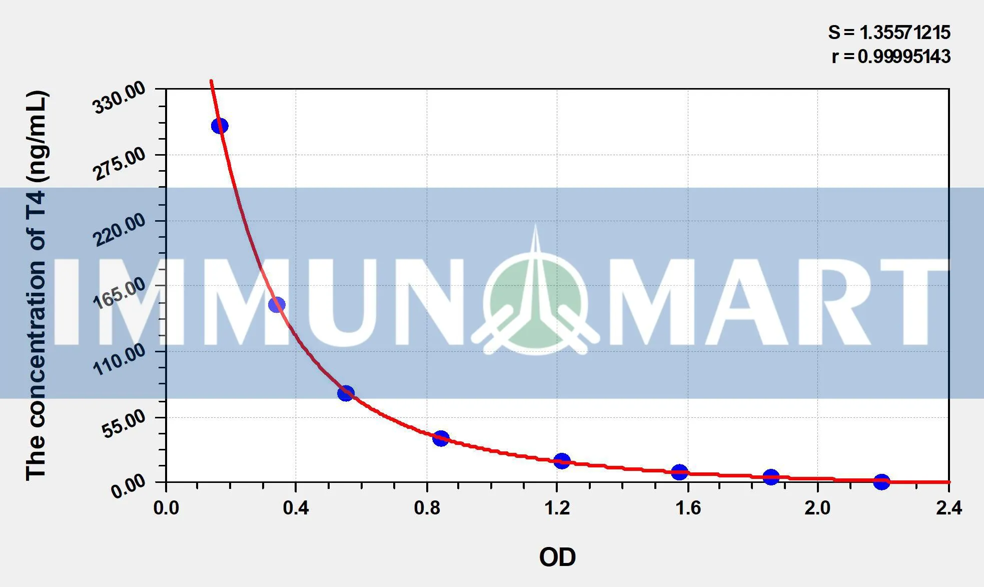 – This assay employs the competitive inhibition enzyme immunoassay technique. The microtiter plate provided in this kit has been pre-coated with Human T4 protein. Standards or samples are added to the appropriate microtiter plate wells then with a biotin-conjugated antibody specific to Human T4. Next, Avidin conjugated to Horseradish Peroxidase (HRP) is added to each microplate well and incubated. After TMB substrate solution is added. The enzyme-substrate reaction is terminated by the addition of sulphuric acid solution and the color change is measured spectrophotometrically at a wavelength of 450nm ± 10nm. The concentration of Human T4 in the samples is then determined by comparing the OD of the samples to the standard curve.