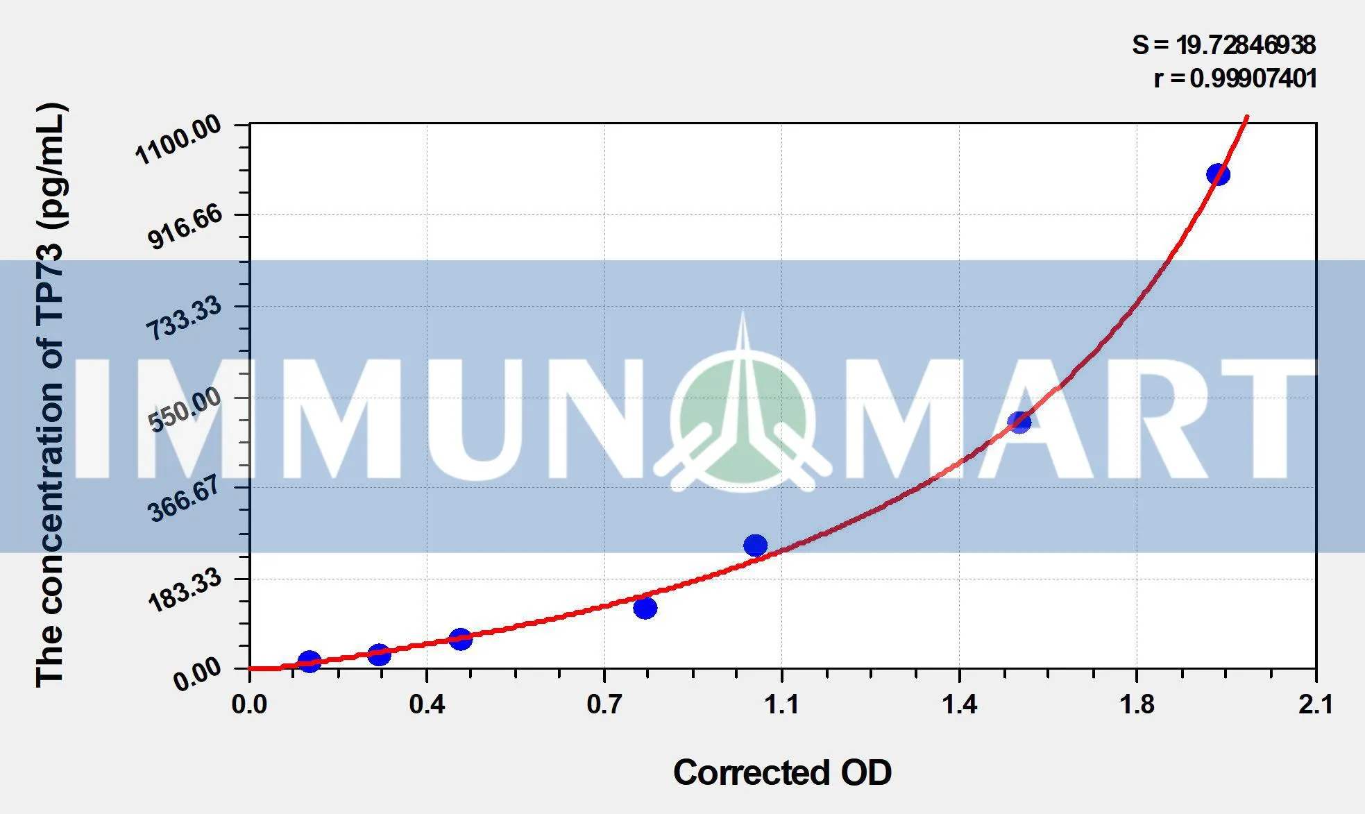 – The test principle applied in this kit is Sandwich enzyme immunoassay. The microtiter plate provided in this kit has been pre-coated with an antibody specific to Human TP73. Standards or samples are added to the appropriate microtiter plate wells then with a biotin-conjugated antibody specific to Human TP73. Next, Avidin conjugated to Horseradish Peroxidase (HRP) is added to each microplate well and incubated. After TMB substrate solution is added, only those wells that contain Human TP73, biotin-conjugated antibody and enzyme-conjugated Avidin will exhibit a change in color. The enzyme-substrate reaction is terminated by the addition of sulphuric acid solution and the color change is measured spectrophotometrically at a wavelength of 450nm ± 10nm. The concentration of Human TP73 in the samples is then determined by comparing the OD of the samples to the standard curve.
