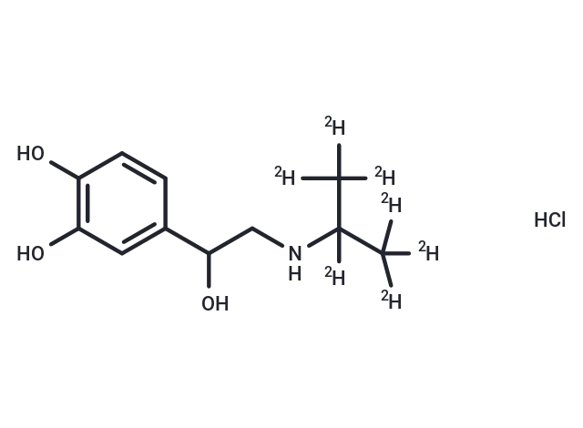 – Isoproterenol-d7 is intended for use as an internal standard for the quantification of isoproterenol by GC- or LC-MS. Isoproterenol is an agonist of β1- and β2-adrenergic receptors (β1- and β2-ARs; Kis = 224 and 458 nM, respectively). It is selective for β1- and β2-ARs over β3-ARs (Ki = 1,570 nM). Isoproterenol inhibits contractions in isolated field-stimulated rat vas deferens (EC50 = 45.6 nM). In vivo, isoproterenol (0.33 mg/kg) decreases blood pressure and increases water intake in nephrectomized rats. It reduces blood pressure and increases heart rate in renal hypertensive rabbits. Isoproterenol inhibits histamine-induced bronchospasms in anesthetized dogs. Formulations containing isoproterenol have been used in the treatment of bradydysrhythmias and to improve breathing during anesthesia.