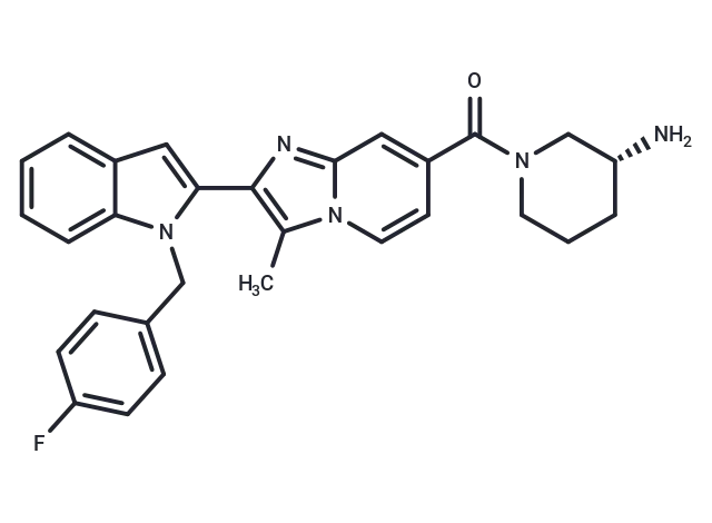 – C(N1C(=CC=2C1=CC=CC2)C3=C(C)N4C(=N3)C=C(C(=O)N5C[C@H](N)CCC5)C=C4)C6=CC=C(F)C=C6