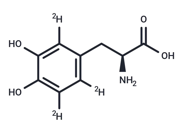 – L-Dopa-2,5,6-d3 is a deuterated compound of L-Dopa. L-Dopa has a CAS number of 59-92-7. Levodopa is an amino acid precursor of dopamine with antiparkinsonian properties. Levodopa is a prodrug that is converted to dopamine by DOPA decarboxylase and can cross the blood-brain barrier. When in the brain, levodopa is decarboxylated to dopamine and stimulates the dopaminergic receptors, thereby compensating for the depleted supply of endogenous dopamine seen in Parkinson’s disease. To assure that adequate concentrations of levodopa reach the central nervous system, it is administered with carbidopa, a decarboxylase inhibitor that does not cross the blood-brain barrier, thereby diminishing the decarboxylation and inactivation of levodopa in peripheral tissues and increasing the delivery of dopamine to the CNS.