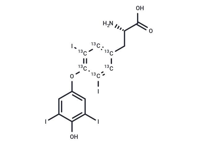 – L-Thyroxine-13C6 is the 13C labeled compound of L-Thyroxine. L-Thyroxine has a CAS number of 51-48-9. Levothyroxine is the major hormone derived from the thyroid gland. Thyroxine is synthesized via the iodination of tyrosines (MONOIODOTYROSINE) and the coupling of iodotyrosines (DIIODOTYROSINE) in the THYROGLOBULIN. Thyroxine is released from thyroglobulin by proteolysis and secreted into the blood. Thyroxine is peripherally deiodinated to form TRIIODOTHYRONINE which exerts a broad spectrum of stimulatory effects on cell metabolism.