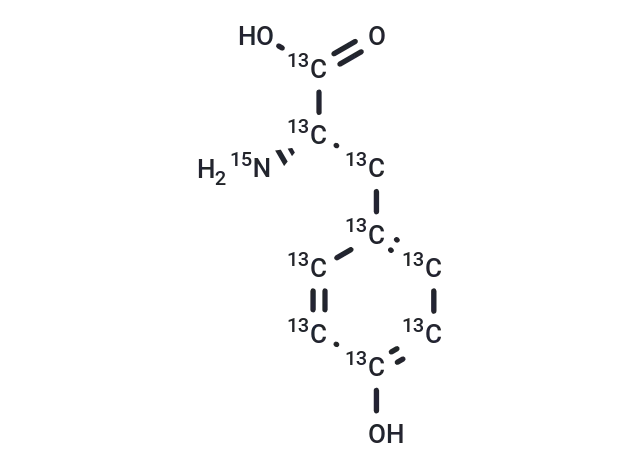 – L-Tyrosine-13C9,15N is intended for use as an internal standard for the quantification of L-tyrosine by GC- or LC-MS. L-Tyrosine is a non-essential amino acid.1It is produced by hydroxylation of phenylalanine by phenylalanine hydroxylase but can also be obtained from dietary sources or degradation of endogenous proteins, resulting in L-tyrosine release.1,2L-Tyrosine is a precursor in the biosynthesis of catecholamine neurotransmitters, melanins, and thyroid hormones.3Plasma, skeletal muscle, and erythrocyte levels of L-tyrosine are decreased in patients with chronic kidney disease.1