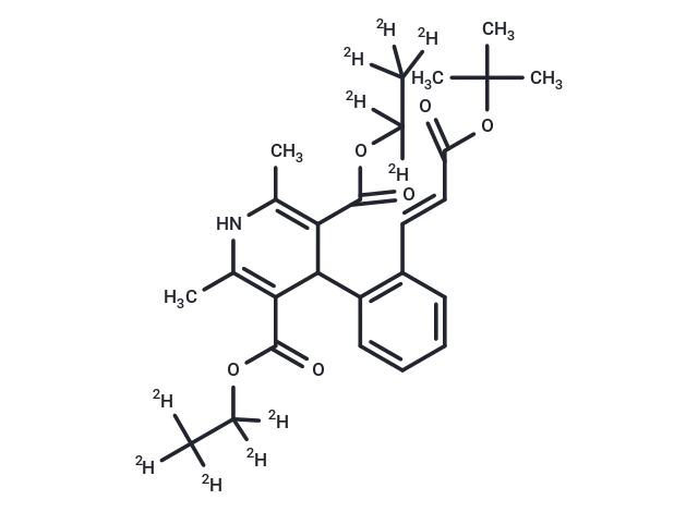 – Lacidipine-d10 is a deuterated compound of Lacidipine. Lacidipine has a CAS number of 103890-78-4. Lacidipine is a lipophilic dihydropyridine calcium antagonist with an intrinsically slow onset of activity. Due to its long duration of action, lacidipine does not lead to reflex tachycardia. It displays specificity in the vascular smooth muscle, where it acts as an antihypertensive agent to dilate peripheral arterioles and reduce blood pressure.