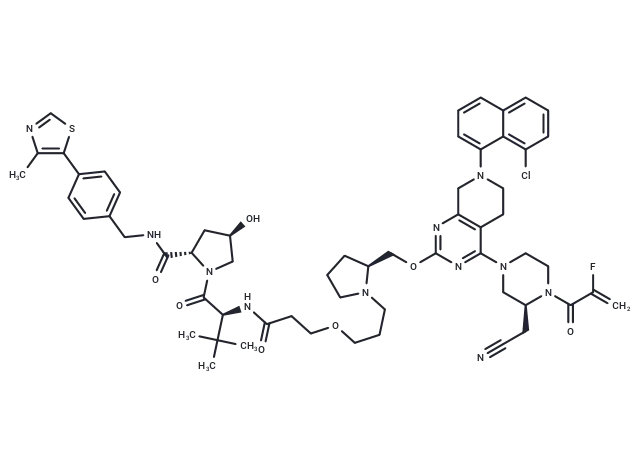– Cc1ncsc1-c1ccc(CNC(=O)[C@@H]2C[C@@H](O)CN2C(=O)[C@@H](NC(=O)CCOCCCN2CCC[C@H]2COc2nc3CN(CCc3c(n2)N2CCN([C@@H](CC#N)C2)C(=O)C(F)=C)c2cccc3cccc(Cl)c23)C(C)(C)C)cc1