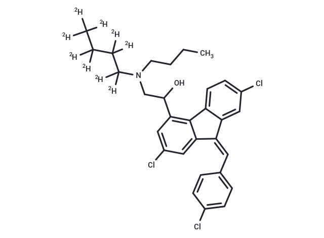– Lumefantrine-d9 is a deuterated compound of Lumefantrine. Lumefantrine has a CAS number of 82186-77-4. Lumefantrine is an antimalarial agent used to treat acute uncomplicated malaria. It is administered in combination with artemether for improved efficacy. This combination therapy exerts its effects against the erythrocytic stages of Plasmodium spp. and may be used to treat infections caused by P. falciparum and unidentified Plasmodium species, including infections acquired in chloroquine-resistant areas.
