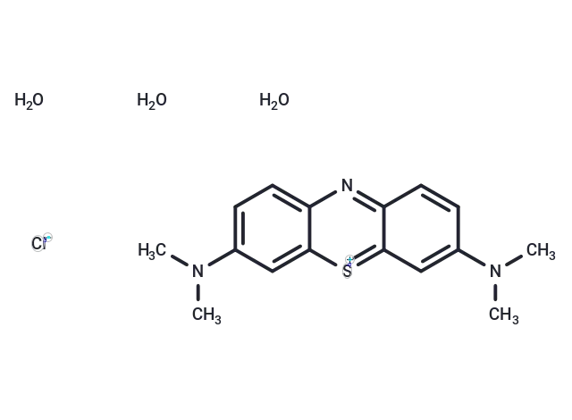 – Methylene Blue trihydrate (Basic blue 9) is a compound consisting of dark green crystals or crystalline powder, having a bronze-like luster. Solutions in water or alcohol have a deep blue color. Methylene Blue trihydrate is used as a bacteriologic stain and as an indicator. It inhibits soluble guanylyl cyclase and has been used to treat cyanide poisoning and to lower levels of methemoglobin. It also inhibits tau filament formation (IC50: 1.9μM).
