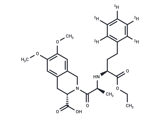 – Moexipril-d5 intended for use as an internal standard for the quantification of moexipril by GC- or LC-MS. Moexipril is a prodrug form of the angiotensin converting enzyme (ACE) inhibitor moexiprilat. It is converted to moexiprilat in vivo by side chain ester hydrolysis. Moexipril inhibits ACE in a cell-free assay (IC50 = 2.7 µM for the rabbit enzyme). It also inhibits phosphodiesterase 4 (IC50s = 38, 160, and 230 µM for PDE4B2, PDE4A5 and PDE4D5, respectively). Moexipril (0.1-30 mg/kg per day) reduces blood pressure in spontaneously hypertensive rats.1 It also reduces infarct volume in a rat model of focal cerebral ischemia when used at a concentration of 0.01 mg/kg.