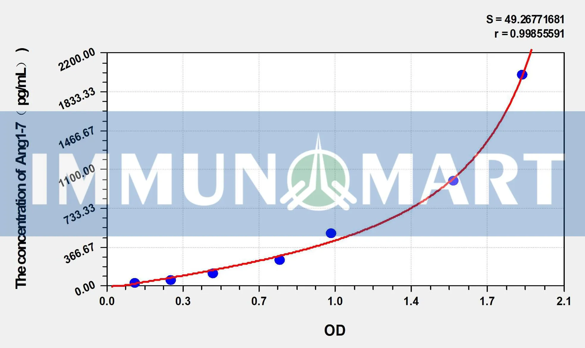 – The test principle applied in this kit is Sandwich enzyme immunoassay. The microtiter plate provided in this kit has been pre-coated with an antibody specific to Mouse Ang1-7. Standards or samples are added to the appropriate microtiter plate wells then with a biotin-conjugated antibody specific to Mouse Ang1-7. Next, Avidin conjugated to Horseradish Peroxidase (HRP) is added to each microplate well and incubated. After TMB substrate solution is added, only those wells that contain Mouse Ang1-7, biotin-conjugated antibody and enzyme-conjugated Avidin will exhibit a change in color. The enzyme-substrate reaction is terminated by the addition of sulphuric acid solution and the color change is measured spectrophotometrically at a wavelength of 450nm ± 10nm. The concentration of Mouse Ang1-7 in the samples is then determined by comparing the OD of the samples to the standard curve.