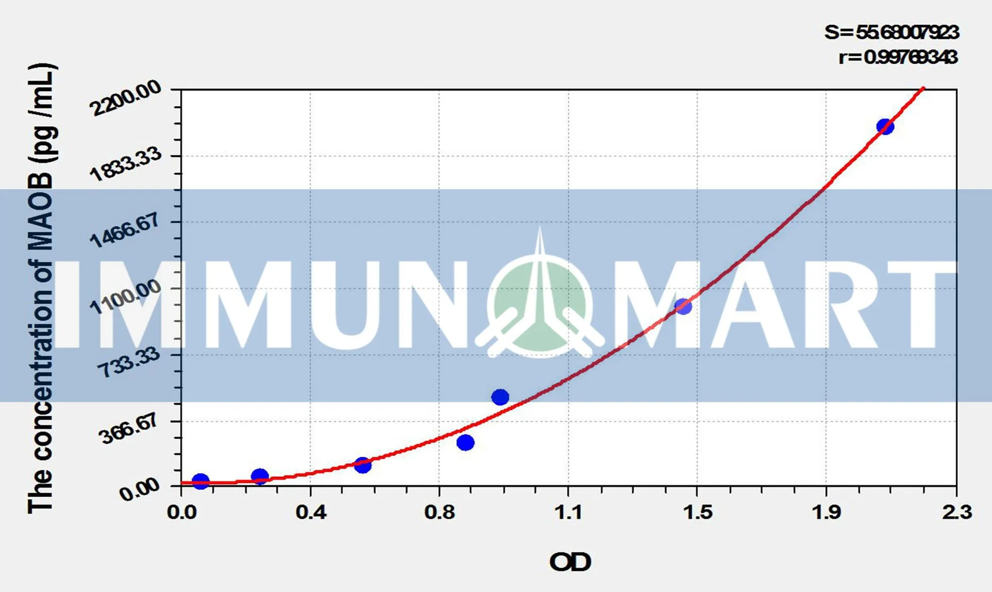 – The test principle applied in this kit is Sandwich enzyme immunoassay. The microtiter plate provided in this kit has been pre-coated with an antibody specific to Mouse MAOB. Standards or samples are added to the appropriate microtiter plate wells then with a biotin-conjugated antibody specific to Mouse MAOB. Next, Avidin conjugated to Horseradish Peroxidase (HRP) is added to each microplate well and incubated. After TMB substrate solution is added, only those wells that contain Mouse MAOB, biotin-conjugated antibody and enzyme-conjugated Avidin will exhibit a change in color. The enzyme-substrate reaction is terminated by the addition of sulphuric acid solution and the color change is measured spectrophotometrically at a wavelength of 450nm ± 10nm. The concentration of Mouse MAOB in the samples is then determined by comparing the OD of the samples to the standard curve.