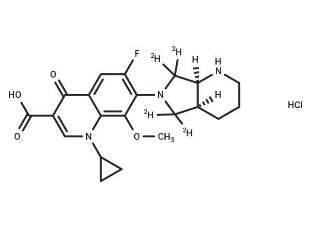 – Moxifloxacin-d4 HCl is a deuterated compound of Moxifloxacin HCl. Moxifloxacin HCl has a CAS number of 186826-86-8. Moxifloxacin is a fourth generation fluoroquinolone with expanded activity against gram-positive bacteria as well as atypical pathogens. Moxifloxacin has been linked to mild ALT elevations during therapy and to rare instances of idiosyncratic acute liver injury with symptoms and jaundice.