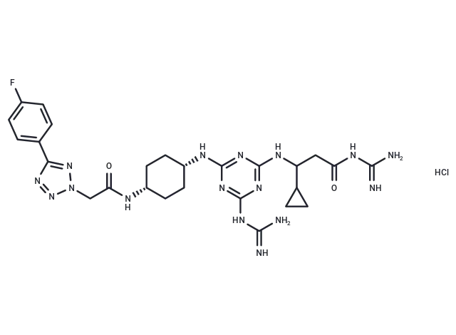– N=C(NC1=NC(N[C@@H]2CC[C@H](NC(CN3N=NC(C4=CC=C(F)C=C4)=N3)=O)CC2)=NC(NC(CC(NC(N)=N)=O)C5CC5)=N1)N.Cl
