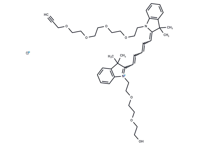 – N-PEG3-N’-(propargyl-PEG4)-Cy5 is a polyethylene glycol (PEG)-derived linker used in the fabrication of proteolysis-targeting chimeras (PROTACs)[1].