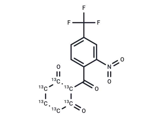 – Nitisinone-13C6is intended for use as an internal standard for the quantification of nitisinone by GC- or LC-MS. Nitisinone is an inhibitor of 4-hydroxyphenylpyruvate dioxygenase (HPPD), which converts 4-hydroxyphenylpyruvate (HPPA) to homogentisate in the tyrosine catabolic pathway.1Nitisinone increases urinary levels of HPPA and 4-hydroxyphenyllactate (HPLA) in rats when administered at a dose of 10 mg/kg. Nitisinone (3 mg/kg) prevents the neonatal lethality of fumarylacetoacetate hydrolase (FAH) deficiency in mice when administered to pregnant dams.2It exhibits hepatoprotective effects inFAH-/-mice, such as prevention of increases in plasma levels of aspartate serine aminotransferase (AST) and conjugated bilirubin, when administration is continued following birth at a dose of 1 mg/kg. Nitisinone (100 μg) decreases urinary excretion of homogentisate and increases urinary excretion of HPPA, HPLA, and 4-hydroxyphenylacetate in a mouse model of alkaptonuria induced by ethylnitrosourea.3Formulations containing nitisinone have been used in the treatment of hereditary tyrosinemia type 1 (HT-1).