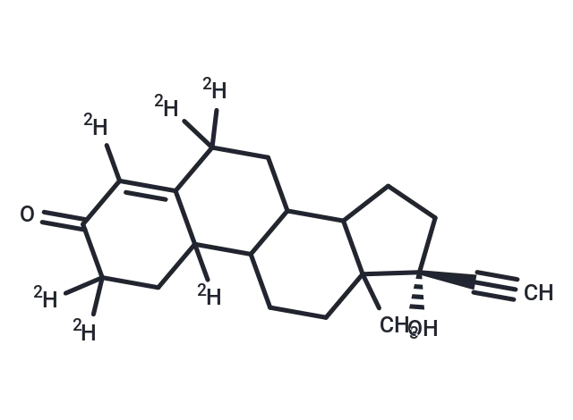 – Norethindrone-2,2,4,6,6,10-d6 is a deuterated compound of Norethindrone. Norethindrone has a CAS number of 68-22-4. Norethindrone is a synthetic progestational hormone with actions similar to those of PROGESTERONE but functioning as a more potent inhibitor of ovulation. It has weak estrogenic and androgenic properties. The hormone has been used in treating amenorrhea, functional uterine bleeding, endometriosis, and for contraception.