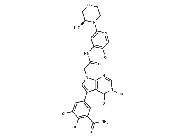 – O=C1C=2C(=CN(CC(NC=3C=C(N=CC3Cl)N4[C@@H](C)COCC4)=O)C2N=CN1C)C5=CC(C(N)=O)=C(O)C(Cl)=C5