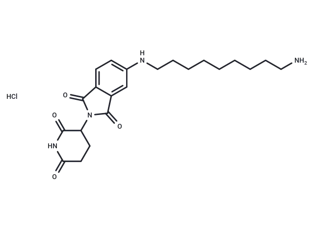 – Pomalidomide-5-C9-NH2 hydrochloride, a Pomalidomide-derived cereblon (CRBN) ligand, facilitates the recruitment of CRBN protein. This compound can be conjugated to a protein-targeting ligand via a linker to create a PROTAC [1].