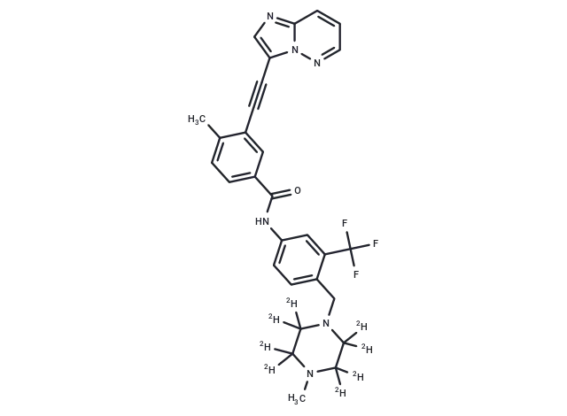 – Ponatinib D8 is a deuterium labeled Ponatinib. Ponatinib is an orally active inhibitor of multi-targeted kinase(Abl, PDGFRα, VEGFR2, FGFR1, and Src with IC50s of 0.37 nM, 1.1 nM, 1.5 nM, 2.2 nM, and 5.4 nM, respectively).