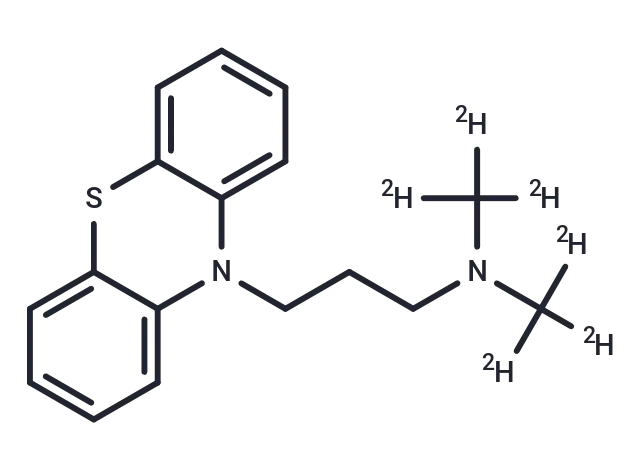 – ProMazine-d6 hydrochloride is a deuterated compound of ProMazine hydrochloride. ProMazine hydrochloride has a CAS number of 53-60-1. Promazine hydrochloride is a phenothiazine with actions similar to CHLORPROMAZINE but with less antipsychotic activity. It is primarily used in short-term treatment of disturbed behavior and as an antiemetic.