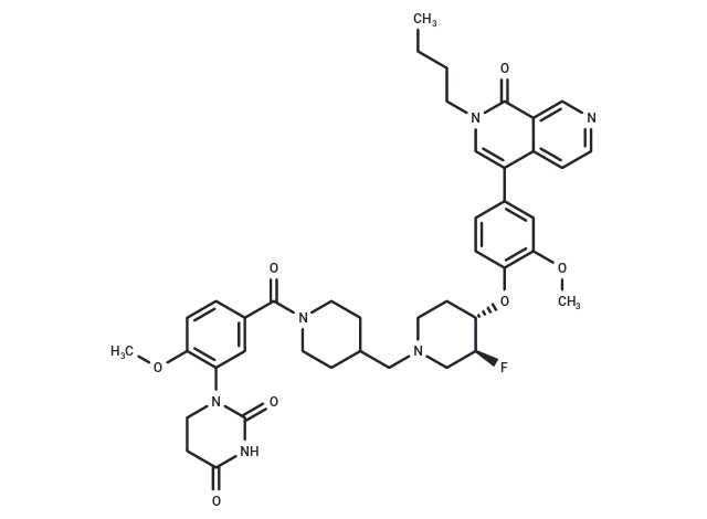 – C(CCC)N1C=C(C=2C(C1=O)=CN=CC2)C3=CC(OC)=C(O[C@@H]4[C@@H](F)CN(CC5CCN(C(=O)C6=CC(=C(OC)C=C6)N7C(=O)NC(=O)CC7)CC5)CC4)C=C3