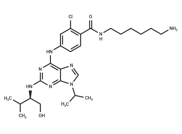 – N(C1=C2C(N(C(C)C)C=N2)=NC(N[C@H](C(C)C)CO)=N1)C3=CC(Cl)=C(C(NCCCCCCN)=O)C=C3