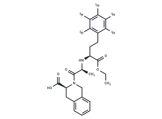 – Quinapril-d5 is intended for use as an internal standard for the quantification of quinapril by GC- or LC-MS. Quinapril is a prodrug form of the angiotensin converting enzyme (ACE) inhibitor quinaprilat. In vivo, quinapril reduces mean arterial pressure in renal hypertensive and spontaneously hypertensive rats. It inhibits angiotensin I-induced pressor responses in normotensive rats and dogs. Quinapril prevents left ventricular heart failure in CHF 14.6 cardiomyopathic hamsters. Formulations containing quinapril have been used in the treatment of hypertension, heart failure, and diabetic nephropathy.
