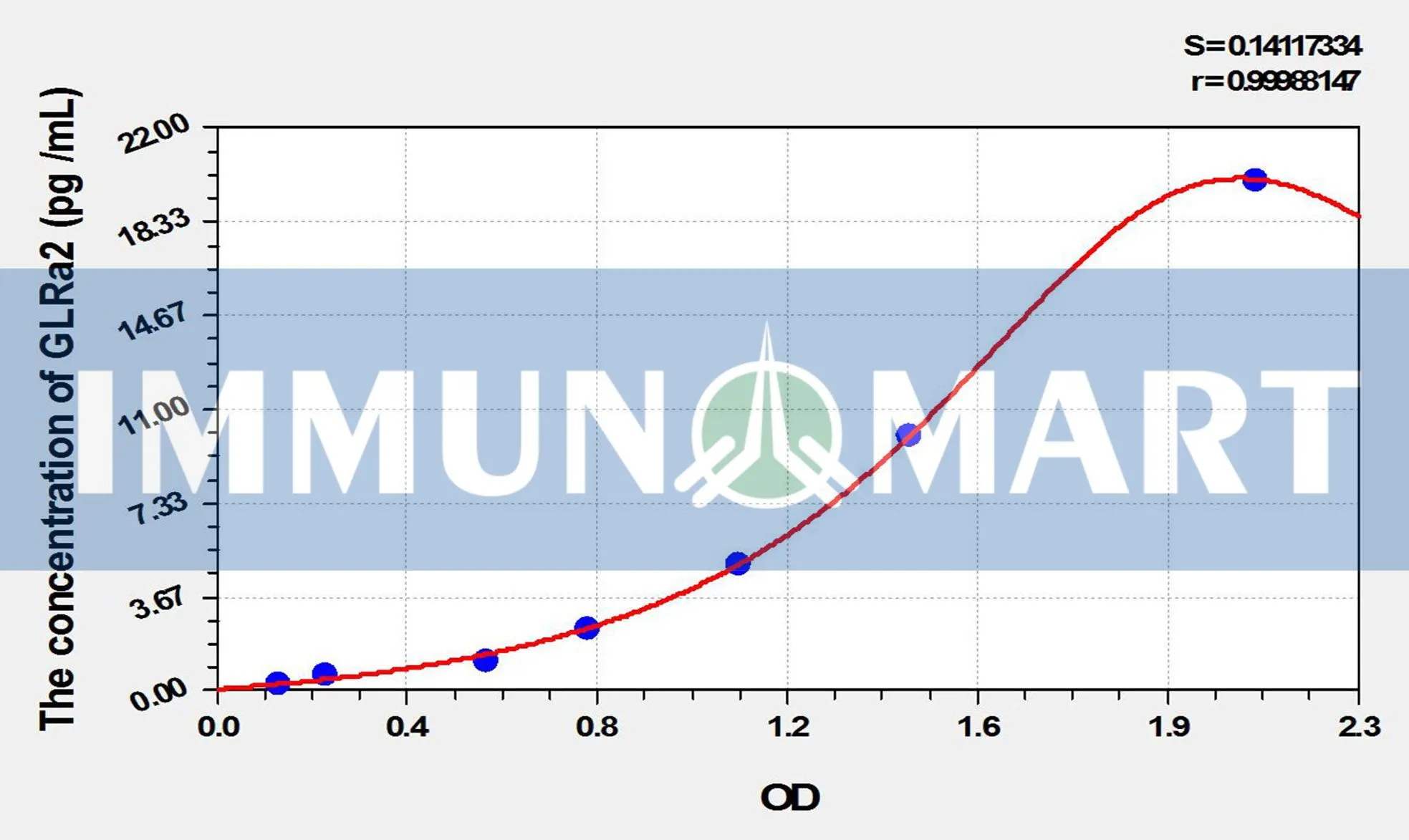 – The test principle applied in this kit is Sandwich enzyme immunoassay. The microtiter plate provided in this kit has been pre-coated with an antibody specific to Rat GLRa2. Standards or samples are added to the appropriate microtiter plate wells then with a biotin-conjugated antibody specific to Rat GLRa2. Next, Avidin conjugated to Horseradish Peroxidase (HRP) is added to each microplate well and incubated. After TMB substrate solution is added, only those wells that contain Rat GLRa2, biotin-conjugated antibody and enzyme-conjugated Avidin will exhibit a change in color. The enzyme-substrate reaction is terminated by the addition of sulphuric acid solution and the color change is measured spectrophotometrically at a wavelength of 450nm ± 10nm. The concentration of Rat GLRa2 in the samples is then determined by comparing the OD of the samples to the standard curve.