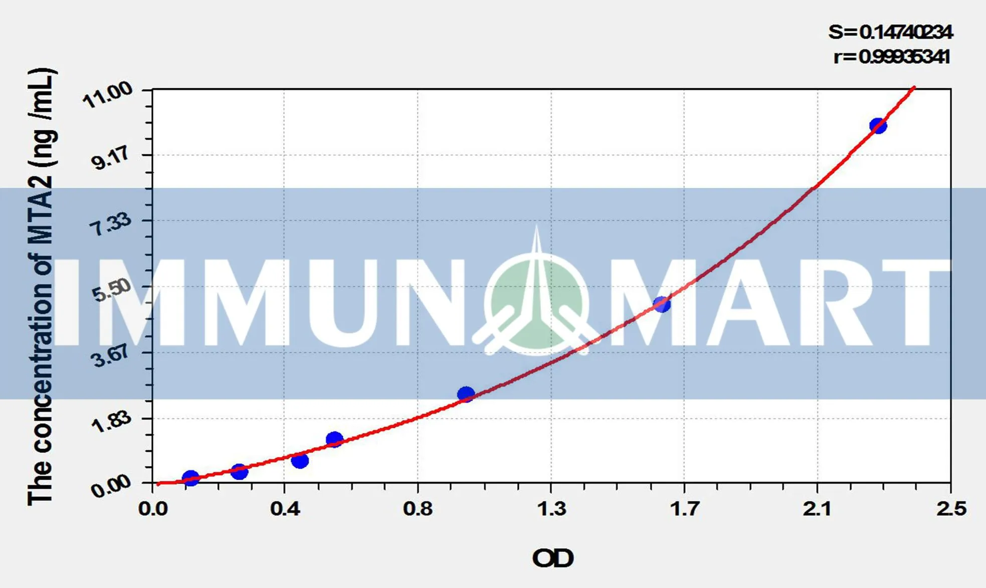 – The test principle applied in this kit is Sandwich enzyme immunoassay. The microtiter plate provided in this kit has been pre-coated with an antibody specific to Rat MTA2. Standards or samples are added to the appropriate microtiter plate wells then with a biotin-conjugated antibody specific to Rat MTA2. Next, Avidin conjugated to Horseradish Peroxidase (HRP) is added to each microplate well and incubated. After TMB substrate solution is added, only those wells that contain Rat MTA2, biotin-conjugated antibody and enzyme-conjugated Avidin will exhibit a change in color. The enzyme-substrate reaction is terminated by the addition of sulphuric acid solution and the color change is measured spectrophotometrically at a wavelength of 450nm ± 10nm. The concentration of Rat MTA2 in the samples is then determined by comparing the OD of the samples to the standard curve.