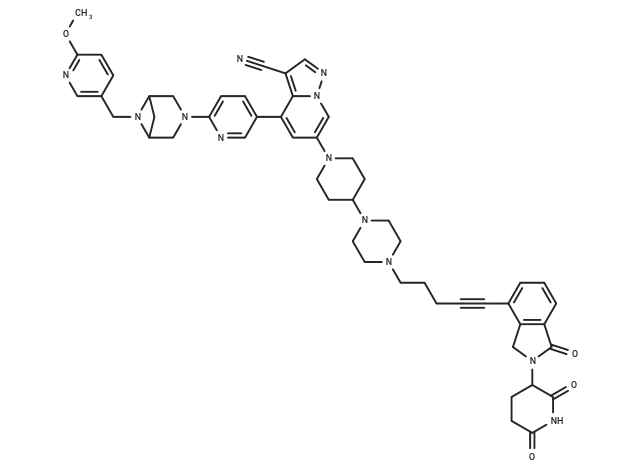 – N#CC=1C=NN2C=C(C=C(C=3C=NC(=CC3)N4CC5N(CC6=CN=C(OC)C=C6)C(C4)C5)C12)N7CCC(N8CCN(CC8)CCCC#CC9=CC=CC=%10C(=O)N(CC9%10)C%11C(=O)NC(=O)CC%11)CC7