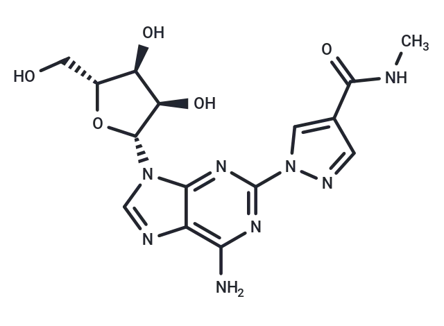 – Regadenoson (CVT-3146) is an adenosine derivative and selective A2A adenosine receptor agonist with coronary vasodilating activity. Upon administration, regadenoson selectively binds to and activates the A2A adenosine receptor, which induces coronary vasodilation. This leads to an increase in coronary blood flow and enhances myocardial perfusion. Compared to adenosine, regadenoson has a longer half-life and shows higher selectivity towards the A2A adenosine receptor. This agent is a very weak agonist for the A1 adenosine receptor and has negligible affinity for the A2B and A3 adenosine receptors.