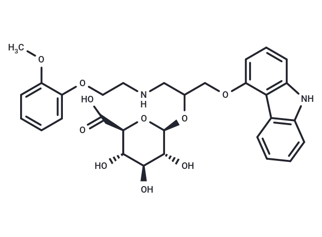 – (R,S)-Carvedilol glucuronide is a racemic mixture of the carvedilol metabolites (R)-carvedilol glucuronide and (S)-carvedilol glucuronide. (R)-Carvedilol glucuronide is formed via glucuronidation of (R)-carvedilol by the UDP-glucuronosyltransferase (UGT) isoforms UGT1A1 and UGT2B4. (S)-Carvedilol glucuronide is formed via glucuronidation of (S)-carvedilol by UGT2B4 and UGT2B7.