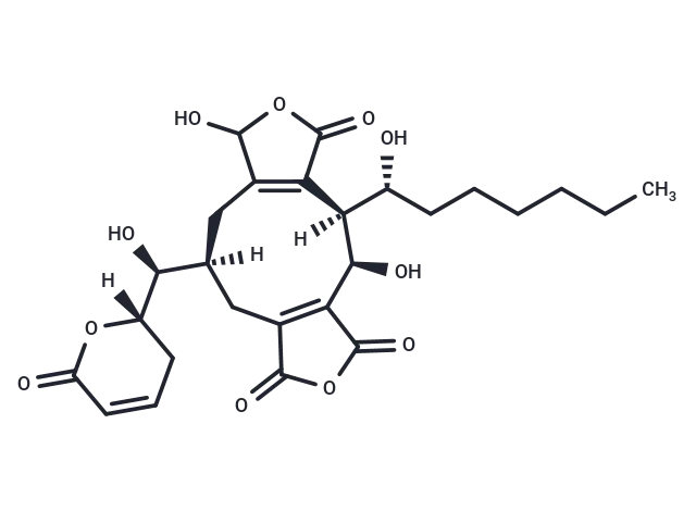 – [H][C@]1(CC=CC(=O)O1)[C@@H](O)[C@@]1([H])CC2=C(C(=O)OC2O)[C@@]([H])([C@H](O)CCCCCC)[C@@H](O)C2=C(C1)C(=O)OC2=O |c:3,34,t:14|