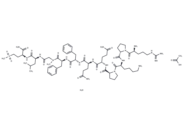 – [Sar9,Met(O2)11]-Substance P acetate is a tachykinin NK1 receptor selective agonist. [Sar9,Met(O2)11]-Substance P acetate is a selective tachykinin NK1 receptor agonist.[Sar9,Met(O2)11]-Substance P acetate and septide (10-100 pmol per rat, i.c.v.) are equipotent in increasing mean arterial blood pressure (MAP) and heart rate (HR), yet they have dissimilar time-course. Both agonists increase dose-dependently face washing and sniffing while [Sar9,Met(O2)11]-Substance P acetate is the sole to produce grooming.