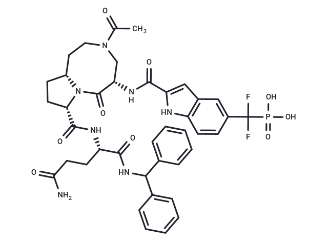 – O=C([C@@H](NC([C@@H]1CC[C@H](CCN(C(C)=O)C[C@@H]2NC(C3=CC(C=C(C(F)(P(O)(O)=O)F)C=C4)=C4N3)=O)N1C2=O)=O)CCC(N)=O)NC(C5=CC=CC=C5)C6=CC=CC=C6