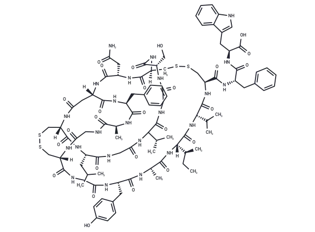 – [H][C@]12CSSC[C@]3([H])NC(=O)C[C@]([H])(NC(=O)[C@H](CC(N)=O)NC(=O)[C@]([H])(CSSC[C@H](NC(=O)[C@@H](NC(=O)[C@@]([H])(NC(=O)[C@H](C)NC(=O)[C@H](Cc4ccc(O)cc4)NC(=O)CNC1=O)[C@@H](C)CC)C(C)C)C(=O)N[C@@H](Cc1ccccc1)C(=O)N[C@@H](Cc1c[nH]c4ccccc14)C(O)=O)NC(=O)[C@H](CO)NC(=O)CNC(=O)C(NC(=O)CNC(=O)[C@H](CC(C)C)NC3=O)C(C)C)C(=O)N[C@@H](Cc1ccccc1)C(=O)N[C@@H](C)C(=O)NCC(=O)N2 |@:129|