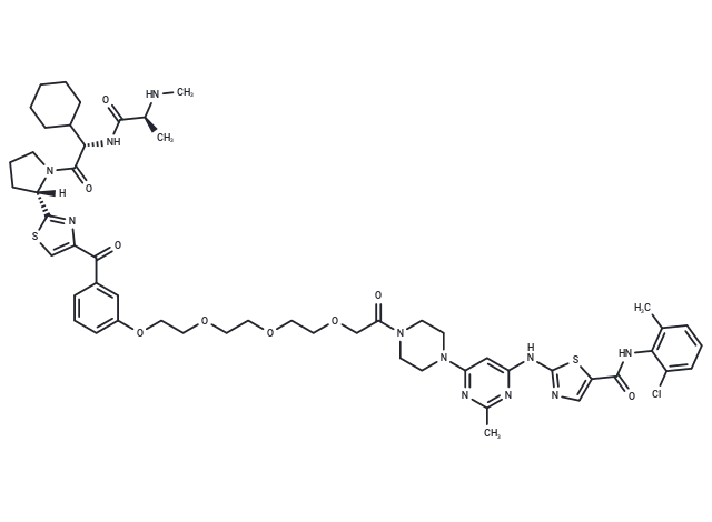 – C([C@@H](NC([C@@H](NC)C)=O)C1CCCCC1)(=O)N2[C@@](CCC2)(C3=NC(C(=O)C4=CC(OCCOCCOCCOCC(=O)N5CCN(CC5)C=6C=C(NC=7SC(C(NC8=C(C)C=CC=C8Cl)=O)=CN7)N=C(C)N6)=CC=C4)=CS3)[H]