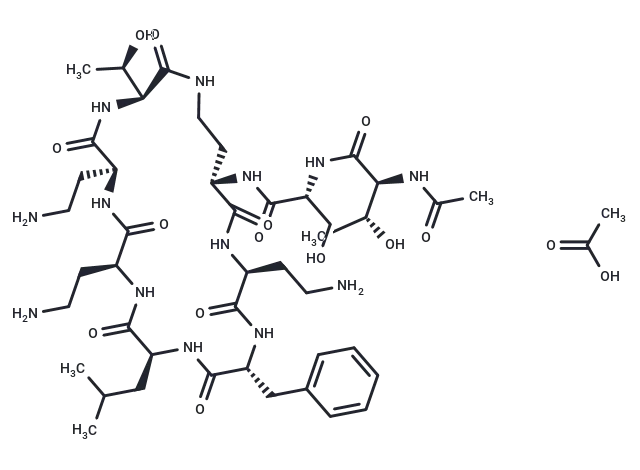– C[C@@H](O)[C@H]1C(NCC[C@H](NC([C@H](NC([C@@H](NC(C)=O)[C@H](O)C)=O)CO)=O)C(N[C@@H](CCN)C(N[C@H](CC2=CC=CC=C2)C(N[C@@H](CC(C)C)C(N[C@@H](CCN)C(N[C@@H](CCN)C(N1)=O)=O)=O)=O)=O)=O)=O.CC(O)=O